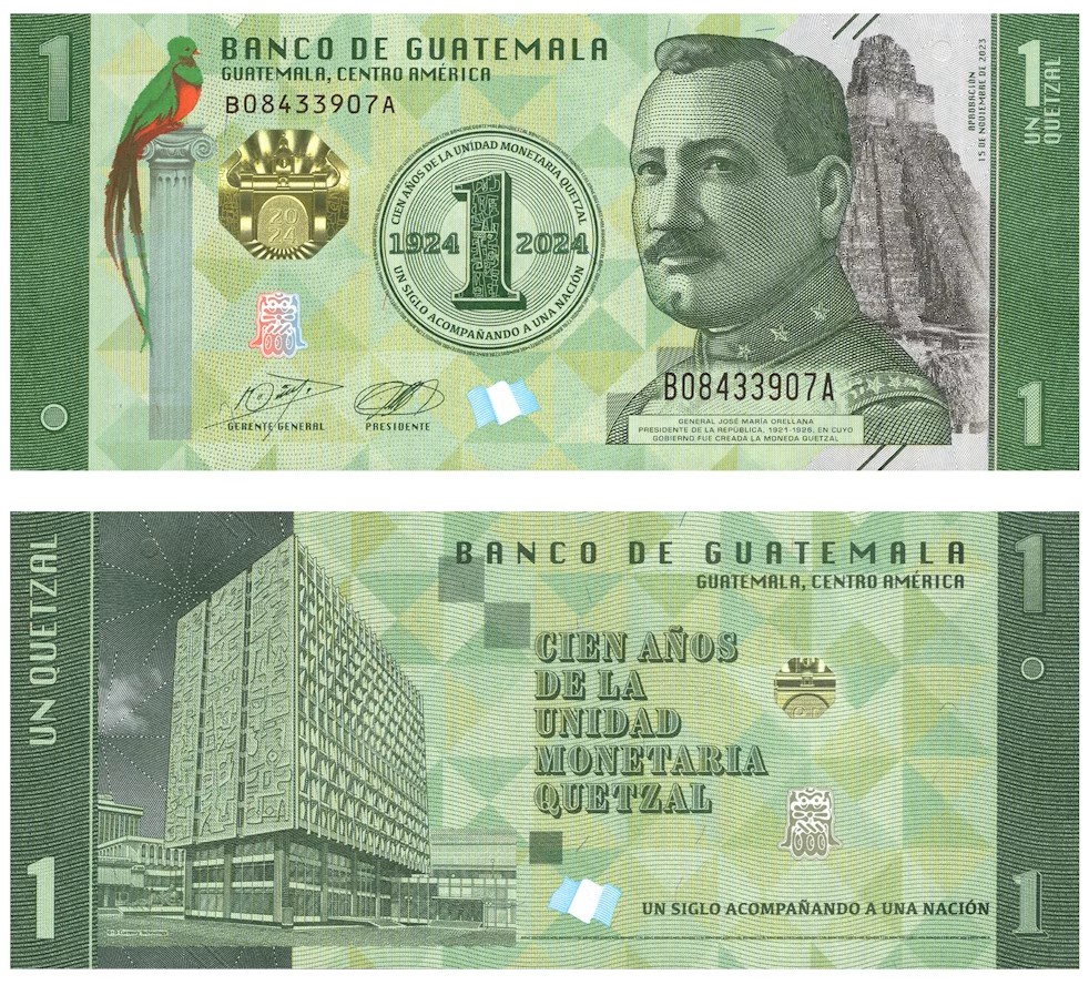 BANCO DE GUATEMALA HAS ISSUED A COMMEMORATIVE Q1.00 BANKNOTE TO CELEBRATE A CENTURY OF THE QUETZAL AS THE NATIONAL CURRENCY. THIS BANKNOTE EMBODIES THE HISTORY AND IDENTITY OF OUR COUNTRY, SERVING AS A SYMBOL OF STRENGTH AND ECONOMIC STABILITY. HOLDING THIS NOTE, WE FEEL THE LEGACY OF GENERATIONS WHO HAVE SHAPED OUR NATION, REMINDING US OF GUATEMALA’S FREEDOM, RESILIENCE, AND GREATNESS. THE BANKNOTE PRESERVES ITS TRADITIONAL ESSENCE WHILE INCORPORATING GRAPHIC ELEMENTS THAT NARRATE THE COUNTRY’S HISTORY, HIGHLIGHTING THE CULTURAL AND HISTORICAL VALUES THAT DEFINE OUR IDENTITY. IT FEATURES THE NATIONAL BIRD, THE QUETZAL, PERCHED ON AN IONIC COLUMN AS A REPRESENTATION OF ECONOMIC STABILITY; A GOLDEN OCTAGON SHOWCASING THE SANTA CATALINA ARCH IN ANTIGUA GUATEMALA AND EL GRAN JAGUAR, AN EMBLEM OF THE MAYAN CITY OF TIKAL, BOTH DECLARED WORLD HERITAGE SITES BY UNESCO. THESE DETAILS HONOR THE COUNTRY’S EVOLUTION AND PROGRESS, AND WITH THE ISSUANCE OF 25 MILLION BANKNOTES, ALL GUATEMALANS FEEL PART OF THIS HISTORIC EVENT. THIS TANGIBLE REMINDER OF OUR UNITY AS A NATION SERVES AS A BRIDGE BETWEEN GENERATIONS, A PIECE OF OUR COLLECTIVE MEMORY THAT INVITES US TO LOOK AT THE PAST WITH GRATITUDE AND THE FUTURE WITH DETERMINATION. THE NOTE ALSO CELEBRATES GENERAL JOSÉ MARÍA ORELLANA, PRESIDENT OF GUATEMALA 1921-1926. UNDER HIS MANDATE, THE FIRST MONETARY REFORM OF THE COUNTRY TOOK PLACE, WITH A FIXED MONETARY UNIT AND A CENTRAL BANKING SYSTEM; IT WAS DURING HIS GOVERNMENT THAT THE QUETZAL MONETARY UNIT WAS CREATED. A CENTURY ACCOMPANYING A NATION!