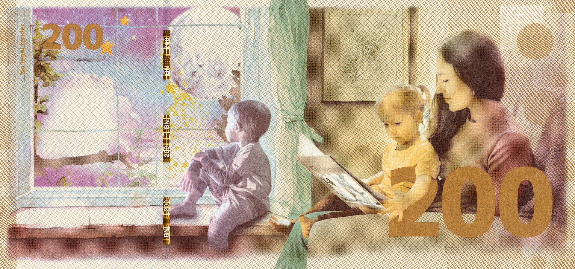 We showcase the fairy tale of “Star Money” on a Banknote and combine it with an interesting, new approach of storytelling by explaining a fairy tale on a banknote. The front side shows the core scenery of the fairy tale and the reverse side shows a woman with 2 children, reading aloud the story. The watermark shows an owl too, like the patch and printed elements. Subtle warm printed colors round out the story. The RollingStar® Patch adds real value to any banknote. This new high-tech feature not only makes storytelling on banknotes much more attractive, but above all it makes them even more secure. On the back, we find the RollingStar®i+ security thread, in the midst of fictional picture of a mother reading to her children the story of the little girl, whose generosity brought her the stars from the sky.