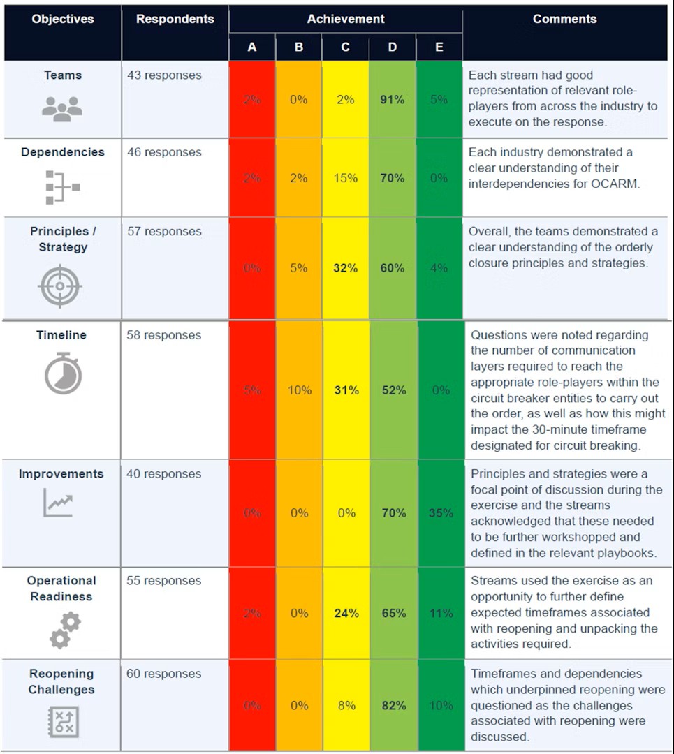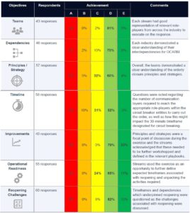 - Formal exercise-based validation: using defined evaluation criteria (team composition, alternates, communication/call-tree effectiveness, dependencies, documented processes/flows, and reopening readiness), and post-exercise polling/assessment captured in the OCARM exercise reporting.Refer to Exhibit 1 (attached image): OCARM Simulation Exercise Participant Objective Assessment – Achievement rated from A – Strongly Disagree to E – Strongly Agree